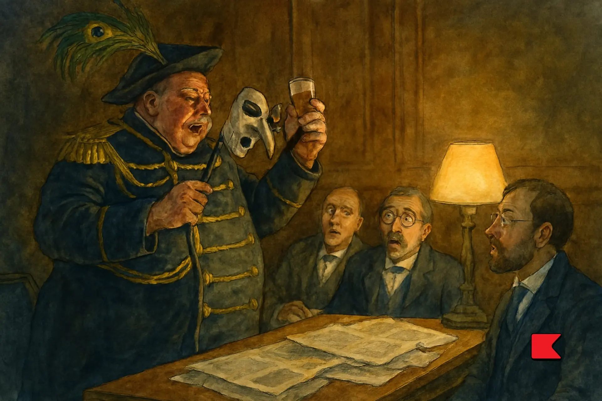 মধ্যরাত্রি। বারোটা বেজেছে। একদল বুদ্ধিজীবী নাচে নামেনি বা মুখোশ পরেনি। সংখ্যায় তারা পাঁচজন। পড়ার ঘরে বড়ো টেবিলটার চারদিকে খবরের কাগজের পৃষ্ঠায় নাক এবং দাড়ি গুঁজড়ে বসে। বসে বসে পড়ছে এবং ঢুলছে। মস্কো ও পিটার্সবুর্গের খবরের কাগজের স্থানীয় বিশেষ প্রতিনিধির ভাষায় বলতে গেলে, সবিশেষ উদারমনোভাবাপন্ন ভদ্রলোকটি 'অনুধ্যানরত'।
