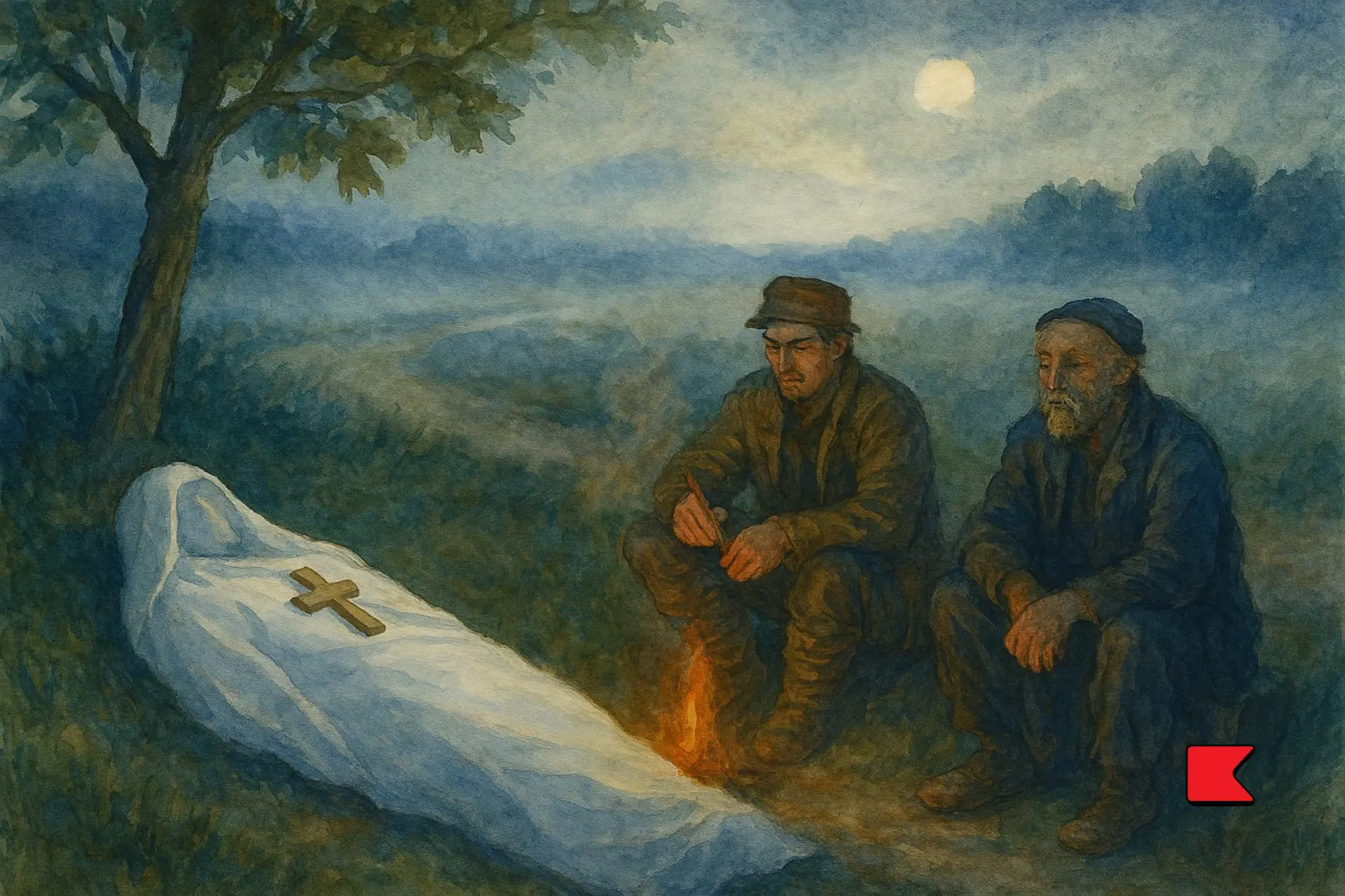 A STILL August night. A mist is rising slowly from the fields and casting an opaque veil over everything within eyesight. Lighted up by the moon, the mist gives the impression at one moment of a calm, boundless sea, at the next of an immense white wall. The air is damp and chilly. Morning is still far off. A step from the bye-road which runs along the edge of the forest a little fire is gleaming. A dead body, covered from head to foot with new white linen, is lying under a young oak-tree. A wooden ikon is lying on