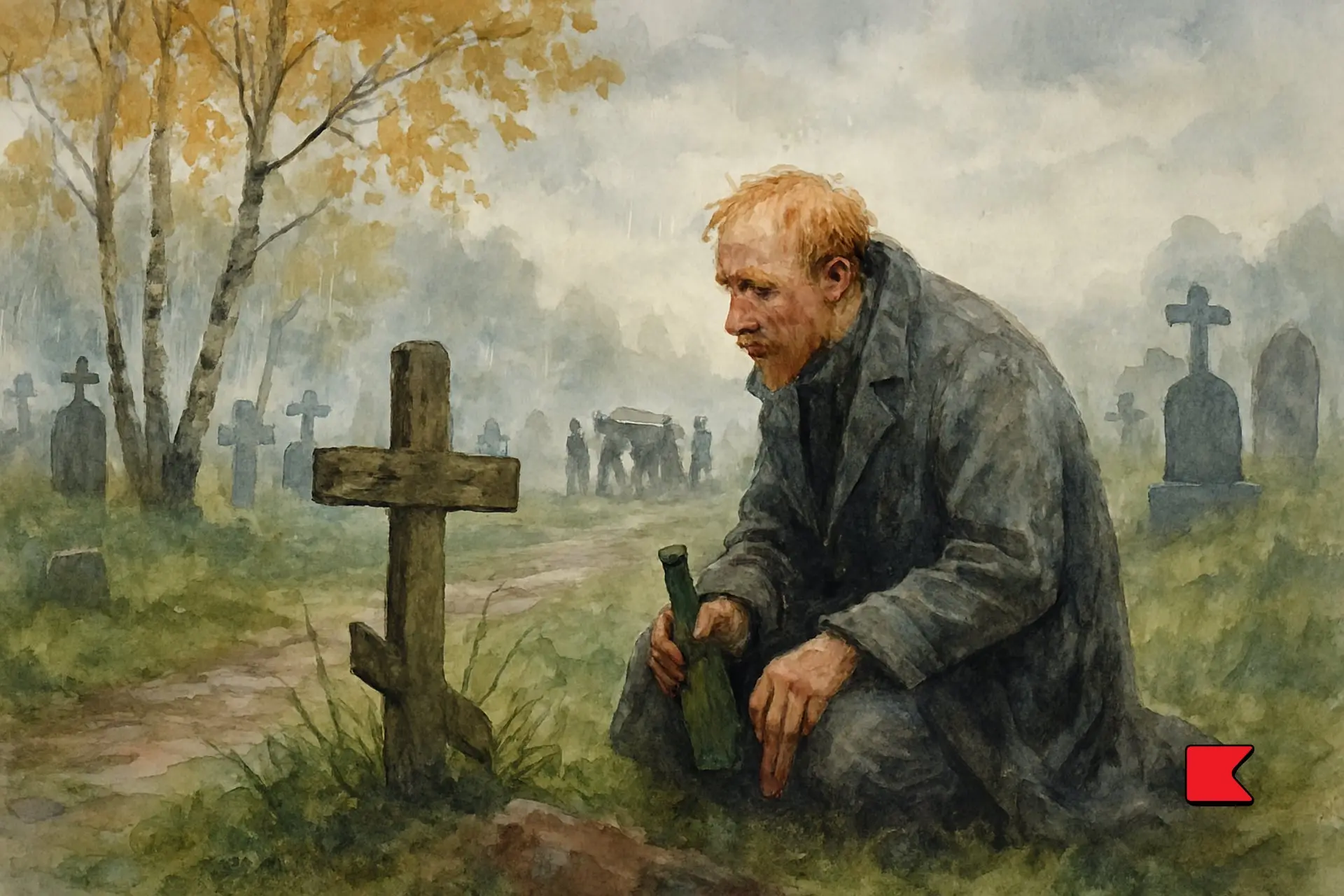 The wind was frolicking among the yellow leaves of the old birch trees, and a shower of thick drops fell upon us from the leaves. One of our party slipped on the clayey soil, and clutched at a big grey cross to save himself from falling.