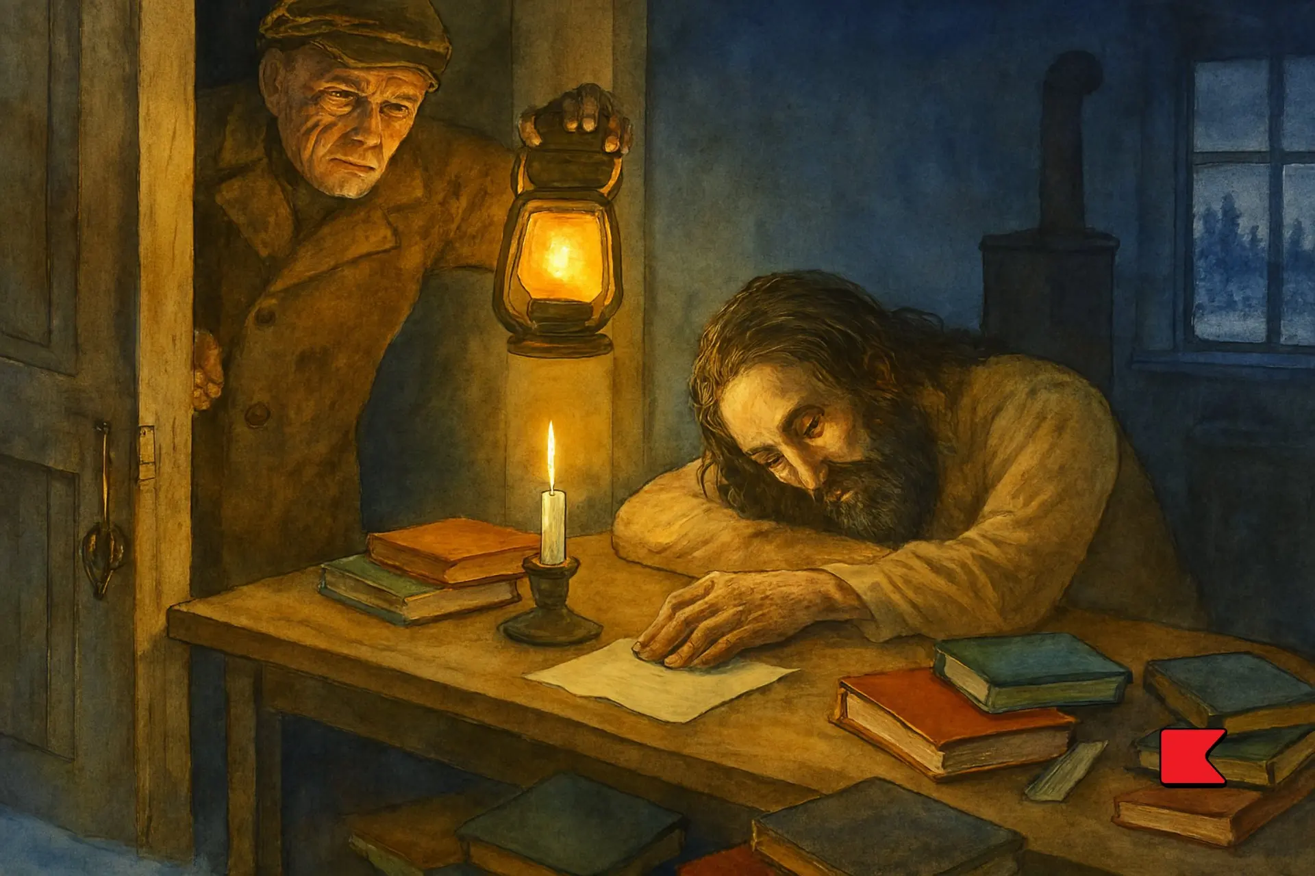 ডিপথিরিয়ার ভয়ে বাড়ির চাকরবাকরদের সকাল থেকেই বাড়ির বাইরে পাঠিয়ে দেওয়া হয়েছিল। কিরিলভ যে অবস্থায় ছিল, পরনে শুধুমাত্র সার্ট আর বোতাম খোলা একটা ওয়েস্টকোট, সেই অবস্থাতেই, এমনকি চোখের জলে ভেজা মুখ ও কার্বলিক এসিডের দাগ-লাগা হাতদুটো না মুছেই, দরজা খুলতে গেল। হলঘরটা অন্ধকার, আগন্তুককে দেখে এইটুকু শুধু বোঝা গেল, সে মাঝারি লম্বা, তার গলায় একটা সাদা মাফলার জড়ানো আর তার প্রকাণ্ড