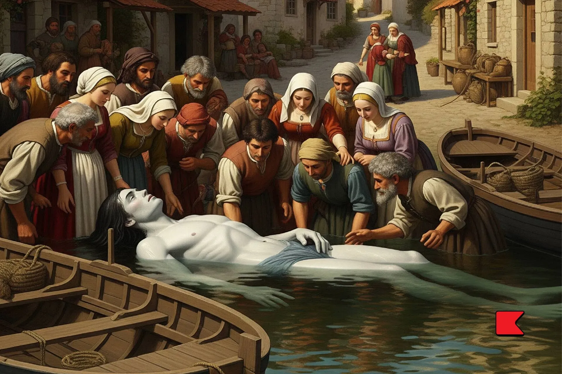 বাচ্চাদের মধ্যে যারা প্রথমে সাগরের ওপর দিয়ে কালো ফুলে ওঠা জিনিসটাকে ধীরে-ধীরে ভেসে আসতে দেখেছিলো, ভেবেছিলো বুঝি শত্রুপক্ষের কোনো জাহাজ। পরে তারা দেখতে পেলো ওর কোনো নিশান বা মাস্তুল নেই, তখন তারা ভাবলো ওটা তিমিমাছ। কিন্তু জিনিসটা যখন ঢেউয়ের দোলায় কূলে এসে পড়লো, তারা সামুদ্রিক আগাছার ঝাড়, জেলিফিশের, মাছের আর সমুদ্রে ভেসেবেড়ানো জিনিসের টুকিটাকি তার গা থেকে সরিয়ে ফেললো, আর তখনই কেবল তারা দেখতে পেলো, ওটা একজন ডুবে-যাওয়া মানুষ।